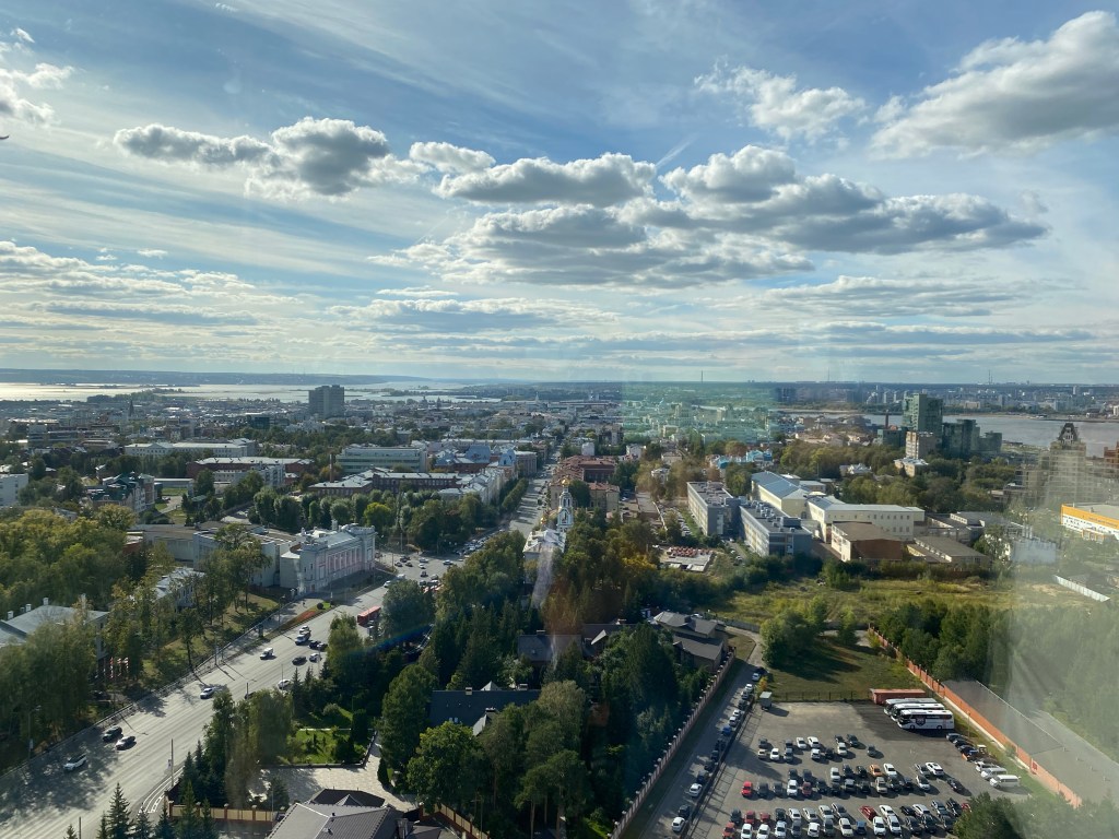 Der letzte Tag des Monats und meines Aufenthaltes in Russland geht zu Ende. Ildus und ich sind heute beschäftigt mit der Buchung des Rückfluges und der Vorbereitung des Abschlussabends beim Rotary-Club. Dazwischen lädt er mich noch zu einem Lunch ein im 25.Stock eines Restaurant. Noch einmal genieße ich den Blick über die Millionenstadt mit der Wolga und den 3 Seen und dem Kreml.