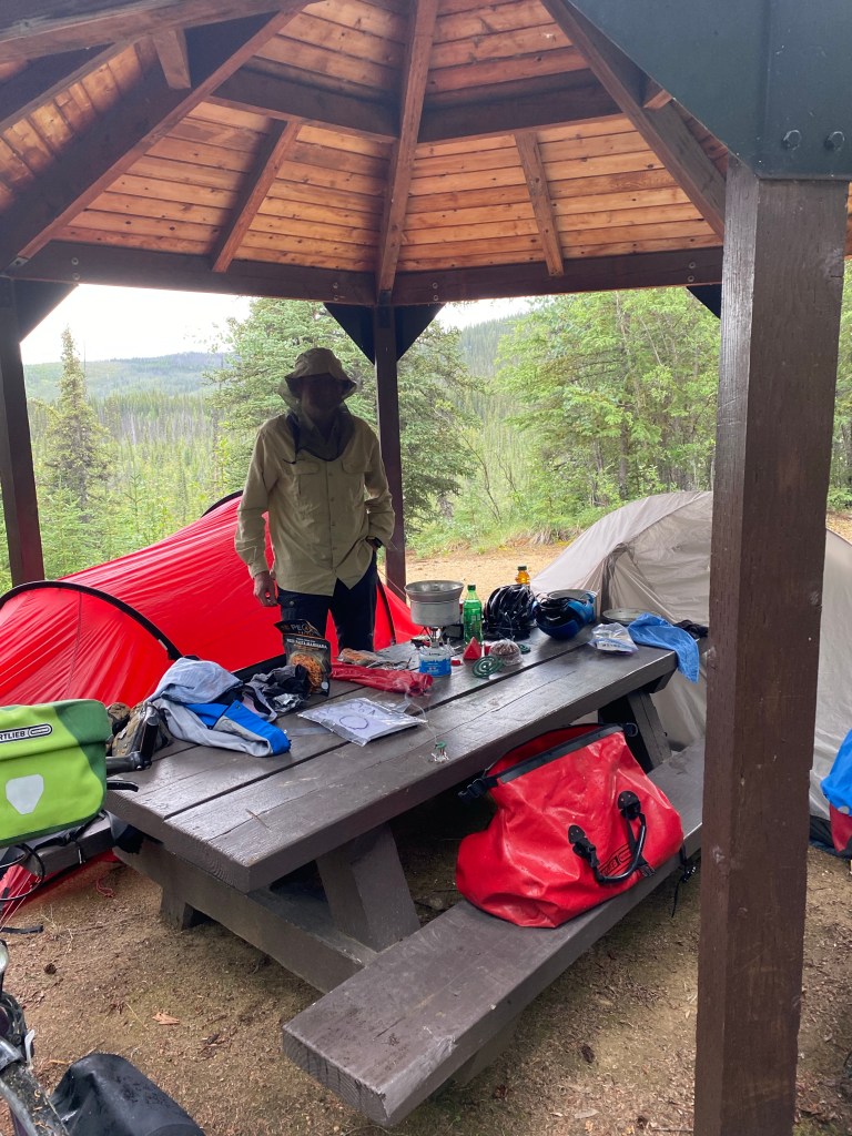 Nach einem guten Frühstück in unserem Hostel geht es nach dem entspannten Ruhetag zuerst für 20 km auf dem Alaska-Highway weiter. Es ist Sonntagmorgen und folglich fehlen die Trucks auf der Straße. Nach den flachen Kilometern auf dem Alaska-Highway biegen wir in den Taylor-Highway ab und sind gleich mit der ersten richtigen Steigung konfrontiert. In dem Radreiseführer steht hier, wem die Steigungen zu steil sind kann hier noch einmal umkehren und auf dem Alaska Highway weiterradeln nach Whitehorse. Wir aber wollen über den Top of the World-Highway nach Dawson City. So nehmen wir auch für die nächsten Stunden viele weitere Steigungen in Kauf. Aber nach dem Ruhetag sind unsere Beine wieder Top und wir kommen gut voran. Auch der inzwischen eingesetzte Regen kann uns nicht bremsen. So erreichen wir in weniger als 7 Stunden Fahrt den Campground, auf dem wir übernachten wollen. In knapp 97 km haben wir mehr als 1400 hm überwunden. Als Camphost empfängt uns ein Deutscher, der sich in der Rente hier ein Zubrot verdient. Er weist uns einen schönen, überdachten Zeltplatz zu. Für den Kalorienverbrauch gibt es heute Pasta Marinara vom Chefkoch Willi.