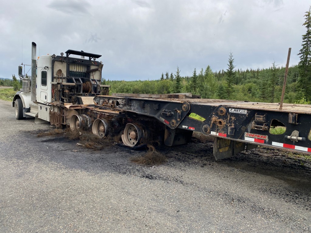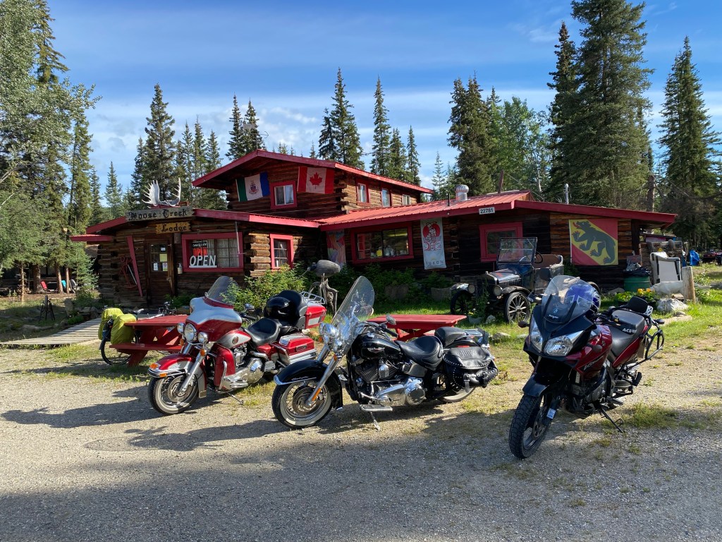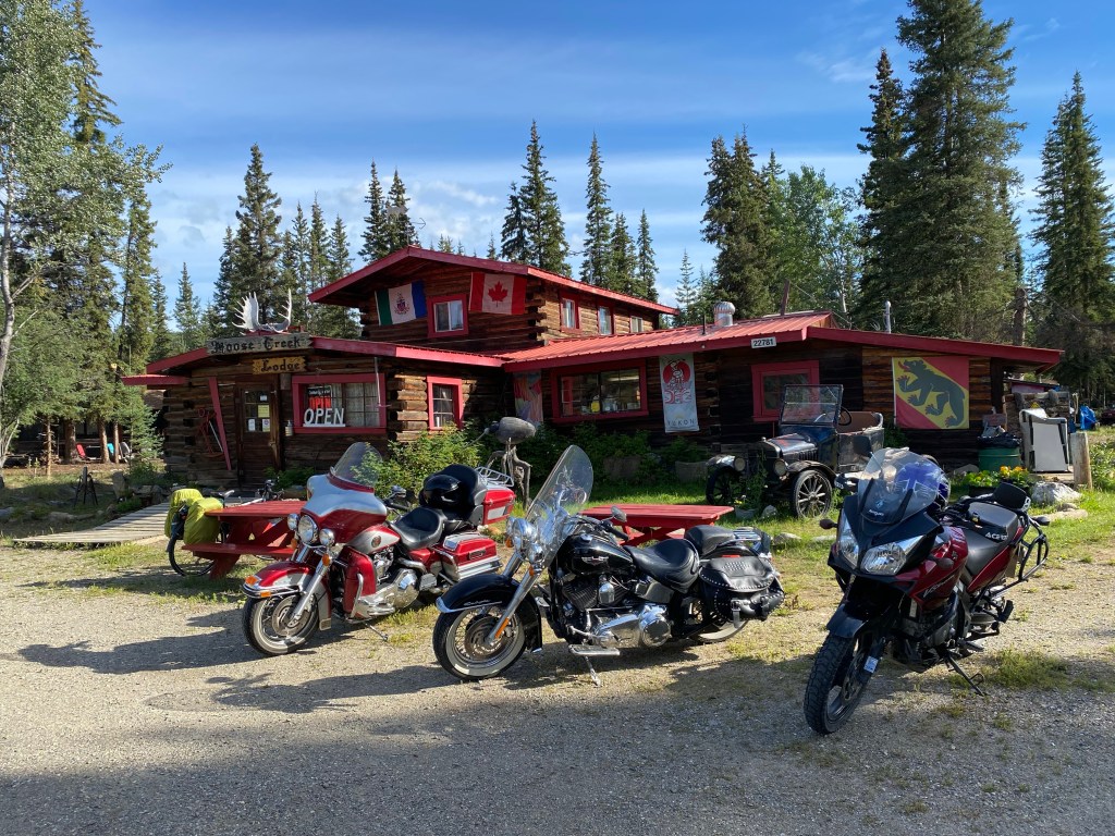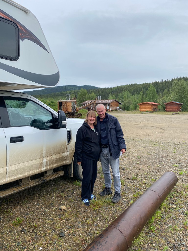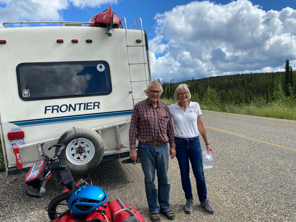 Hier fängt der Denpster-Highway an und geht nach Inuvik und Tuktojaktuk na Polarmeer.Das Ehepaar aus Köln hat uns spontan zum Kaffee eingeladen. Und ein Bier mit auf den Weg gegeben.Da hat einer seinen Luxuscamper neben die Straße gesetzt. Wird vermutlich nicht billig. Der Abschleppdienst kommt von Whitehorse. Das sind 450 km, einfache Strecke.Nach höflicher Anfrage durften wir hinter dem Haus unsere Zelte aufstellen. Und bekamen auch nach 20 Uhr noch eine warme Suppe mit Wurst. Und am anderen Morgen ein reichhaltiges Frühstück
