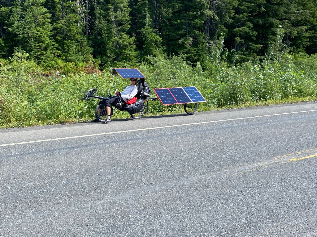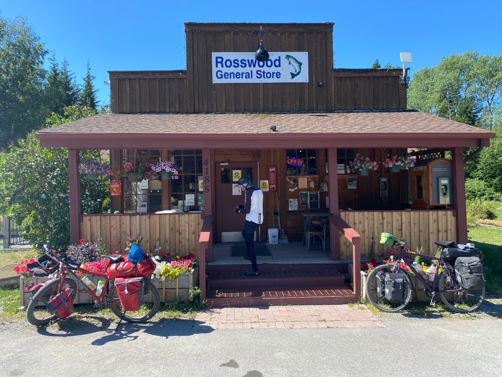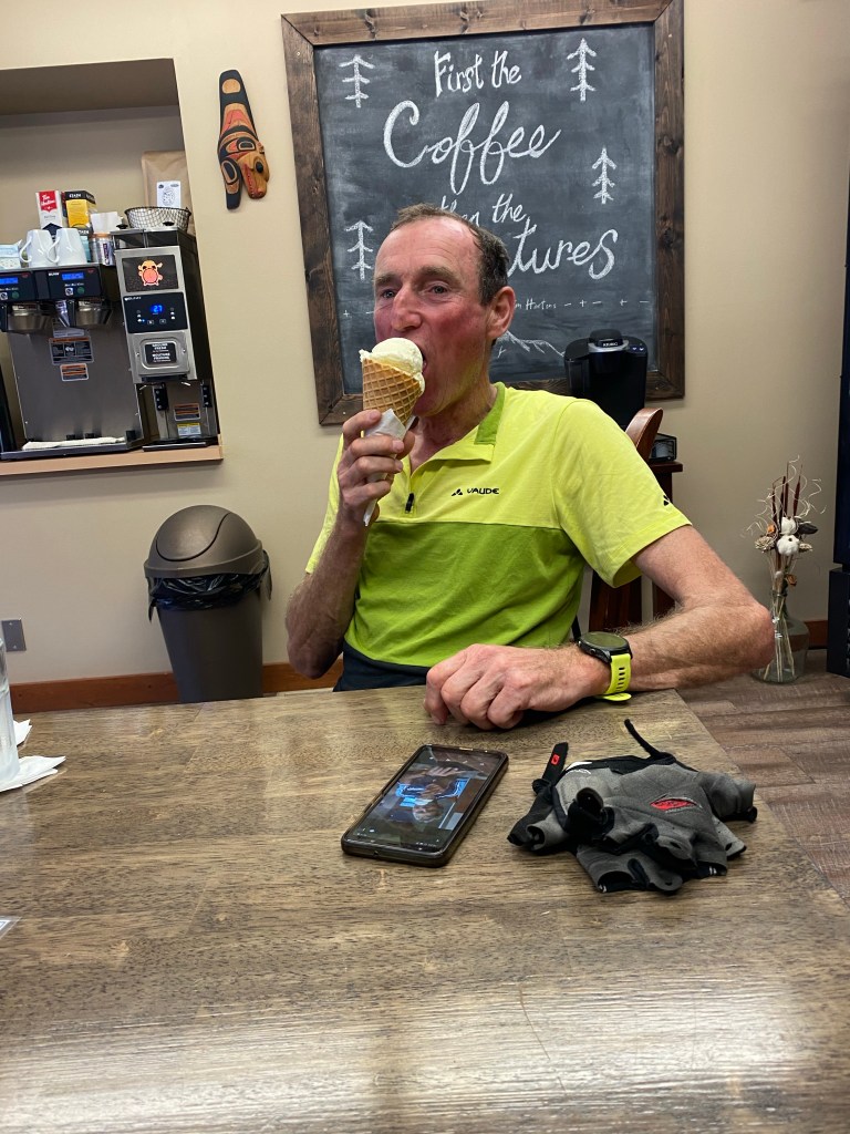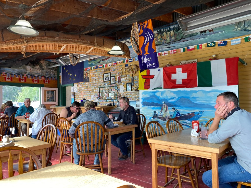 Heute geht es wieder ohne Frühstück los. Das wollen wir nach 26 km in Chicken, der einzigen Möglichkeit auf dem Weg nach Dawson City einnehmen. Es geht von Anfang an wieder streng bergauf. Regen und Sonne wechseln sich ab. Nach 2 Stunden erreichen wir die kleine Ansiedlung. Beim Frühstück sitze ich neben einem Ehepaar, das einen Haufen Formulare vor sich hat und sich aufgeregt unterhält. Ich frage nach dem warum und wohin. Sie sind auch Deutsche und wollten über den gleichen Grenzübergang nach Kanada. Man hat sie zurück geschickt, um eine kanadische COVID-App herunterzuladen und auszufüllen. An der Grenze gibt es kein Internet, daher hat man sie 67 km zurückgeschickt nach Chicken, um die App auszufüllen. In Chicken aber ist das Internet so schlecht, dass es unmöglich ist, die App überhaupt herunterzuladen. Sie sagen uns, wir bräuchten gar nicht weiterfahren, uns würde das Gleiche blühen. Das Risiko ist uns zu groß. Denn nach 67 km und 1200 hm an der Grenze abgewiesen zu werden, ist uns zu groß. So fragen wir die beiden, ob sie uns mitnehmen zurück nach Tok, denn dort gibt es zuverlässiges Internet. Sie sind freundlicherweise bereit und nehmen uns in ihrem Camper mit zurück nach Tok. Das sind 120 km teils üblicher Straße. Die Räder lassen wir solange in Chicken stehen. Das Ausfüllen der App stellt uns vor weitere fast unlösbare Probleme. Um 19 Uhr haben wir aber die App komplett und fahren zurück nach Chicken. Wir sind erleichtert und hoffen, morgen mit dieser App über die Grenze zu kommen. Ohne Gabi und ihren Mann Gerd hätten wir das nicht geschafft. Müde, aber auch zufrieden, übernachten wir auf dem Campground in Chicken.