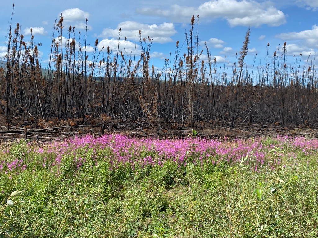 Krasser Unterschied: Blühende Blumen, dahinter verkohlte Bäume. Wir radeln ca. 20 km an solchen verbrannten Wäldern entlang.Wir überqueren hier wieder den Yukon.Ungeplantes Treffen an einem Aussichtspunkt: ein junges Ehepaar mit Range Rover auf Weltreise und unsere wiedergefundene Helfer.
