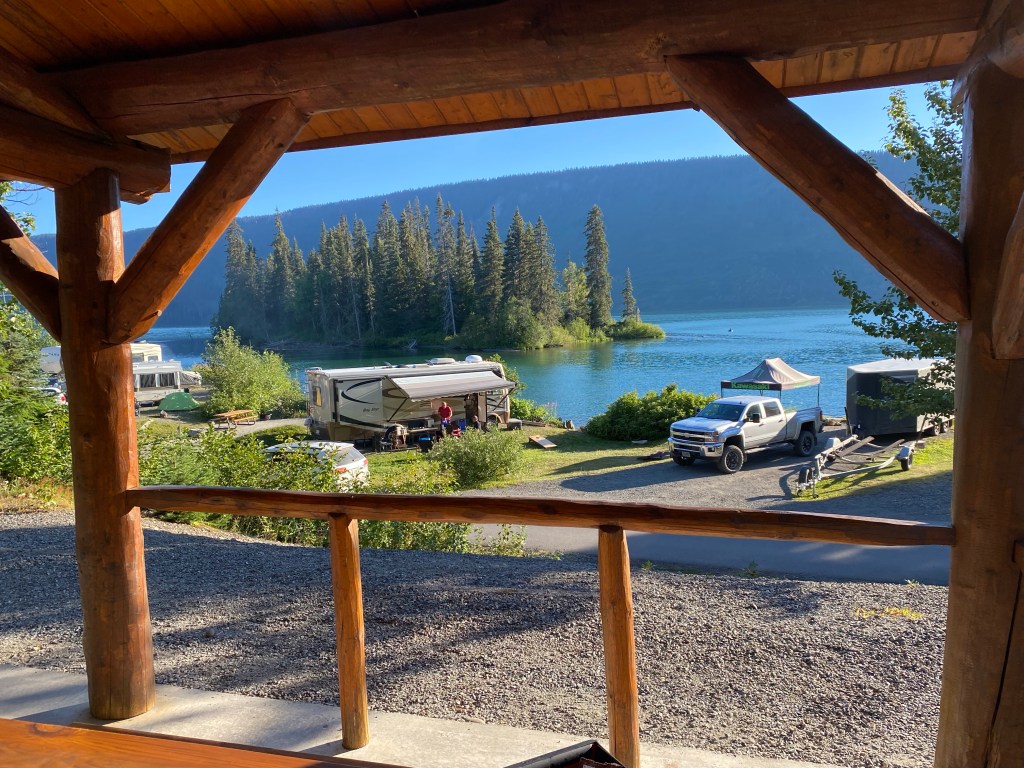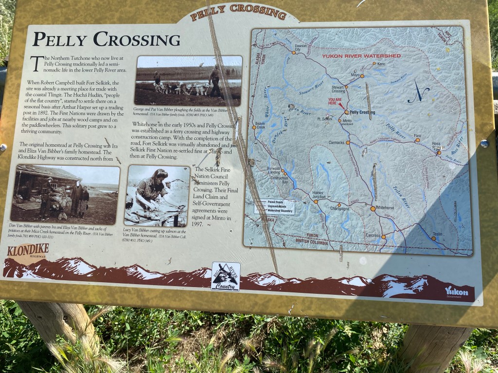 Das Wetter bessert sich. Das Zelt bei Sonne abzubauen ist einfach schöner. Wir bekommen von der schweizerischen Gastfrau ein reichhaltiges Frühstück. Das ist auch bitter nötig. Es geht gleich ziemlich bergauf. Die vorgesehene Verpflegungssatation nach 30 km bei Steward- Crossing ist wieder einmal ein Flop. Nichts zu Essen, nichts zu Trinken. So geht es mit nur einer kleinen Riegel-Pause in die zweite Tageshälfte Die Steigungen und der Wind lassen nach und so sind wir schon vor 17 Uhr kurz vor dem Etappenziel in PellyCrossing. Auf einer Ausssplattform halten wir Smalltalk mit einem deutschen Ehepaar, die in Range Rover unterwegs sind. Wir sprechen gerade über Bären, als ich etwa 100 Meter entfernt einen Schwarzbären über die Straße laufen sehe. Aber bis ich am Foto bin, ist er schon verschwunden. Schade! Aber die Gelegenheit wird wieder kommen. Und die nächste Überraschung: Ausgerechnet auf diesem Parkplatz machen auch Gabi und Gerd Pause. Die beiden, die uns mitgenommen haben nach Tok und uns behilflich waren, über die Grenze zu kommen. Wir hätten nicht gedacht, sie so schnell wiederzusehen. Sie waren in der Zwischenzeit oben am Polarmeer in Tuktojaktuk. Es kommt ein ausgiebiger Erfahrungsaustausch zustande. An der Tankstelle verabschieden wir uns ein zweites Mal. Gleich gegenüber ist der Campingplatz, auf dem wir ein schönes Plätzchen finden. Es gibt sogar Internet hier, sodass ich wieder Berichte absetzen kann.