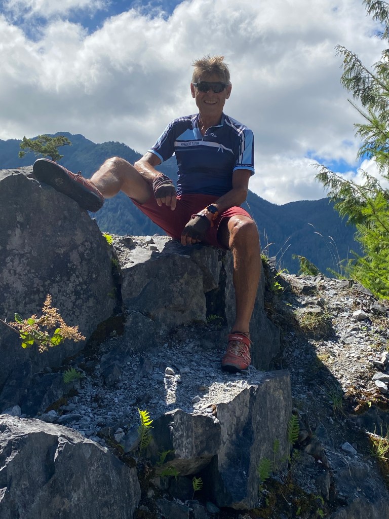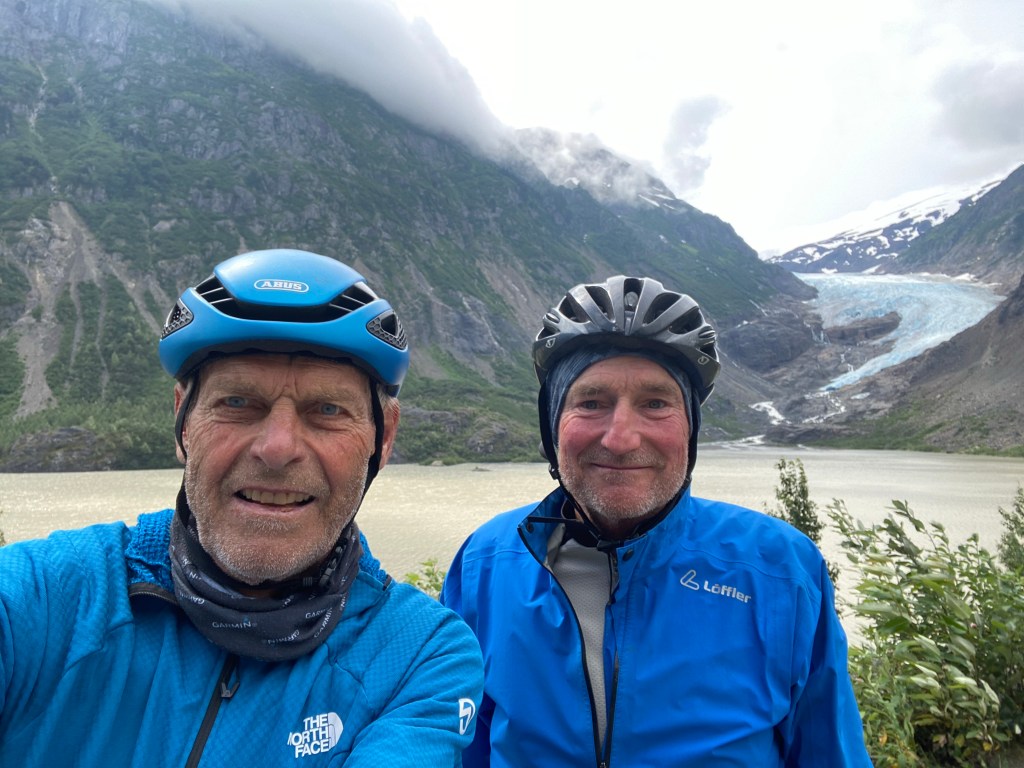 Und wieder einmal werden wir durch die Regentropfen geweckt, die gegen das Zeltdach prasseln. Im Regen bauen wir die Zelte ab. Das einzig positive an diesem Morgen ist, dass uns Gabi und Gerd zum Frühstück im Camper einladen. Wir genießen zusammen mit Ihnen den Kaffee und das Toastbrot und vereinbaren, dass sie unser Gepäck bis zur Grenze mitnehmen und es dort irgendwo abstellen. Das ermöglicht uns, diese 65 km und 1200 hm ohne Gepäck zurückzulegen. Und es ist tatsächlich wie fliegen, auf einmal ohne soviel Gewicht am Rad fahren zu können. Gegen 13 Uhr erreichen wir den „TOP OF THE WORLD HIGHWAY „ von dem Willi schon seit Wochen spricht. Und er ist ja auch der Grund, warum wir diese Strapazen auf uns genommen haben. Und es lohnt sich wirklich. Das Wetter hat sich inzwischen gebessert und wir haben einen unglaublichen Rundumblick auf die Berge in Alaska und Kanada. Dieser ungeteerte Highway führt über mehr als 120 km immer auf Bergrücken in Richtung Dawson City. Nach einem kräftezehrenden, über 4 km langen Anstieg erreichen wir die kanadische Grenze. Die Grenzstation liegt auf einem Berg wie eine Alpvereinshütte in den Alpen. Und wir haben Glück. Der Grenzbeamte ist freundlich und fragt nur nach der ominösen COVID App, die uns soviel Aufwand beschert hat, ohne sie sehen zu wollen. So sind die Grenzformalitäten schnell erledigt und er füllt sogar unsere Trinkflaschen auf und stellt sich noch für ein Erinnerungsfoto zur Verfügung. Wir sind jetzt in Kanada im Landesteil Yukon. Wir legen auf dem TotW-Highway weitere 20 km zurück, um morgen keine zu lange Etappe nach Dawson zu haben. Seit dem kargen Frühstück habe wir nur ein paar Riegel gegessen. So kocht Willi heute für jeden anderthalb Portionen. Die Plagegeister haben an der Grenze nicht Halt gemacht, Auch ich Kanada schwirren sie uns um die Ohren. Nach unserer Königsetappe mit 90 km und mehr als 1800 hm liegen wir früh im Schlafsack.