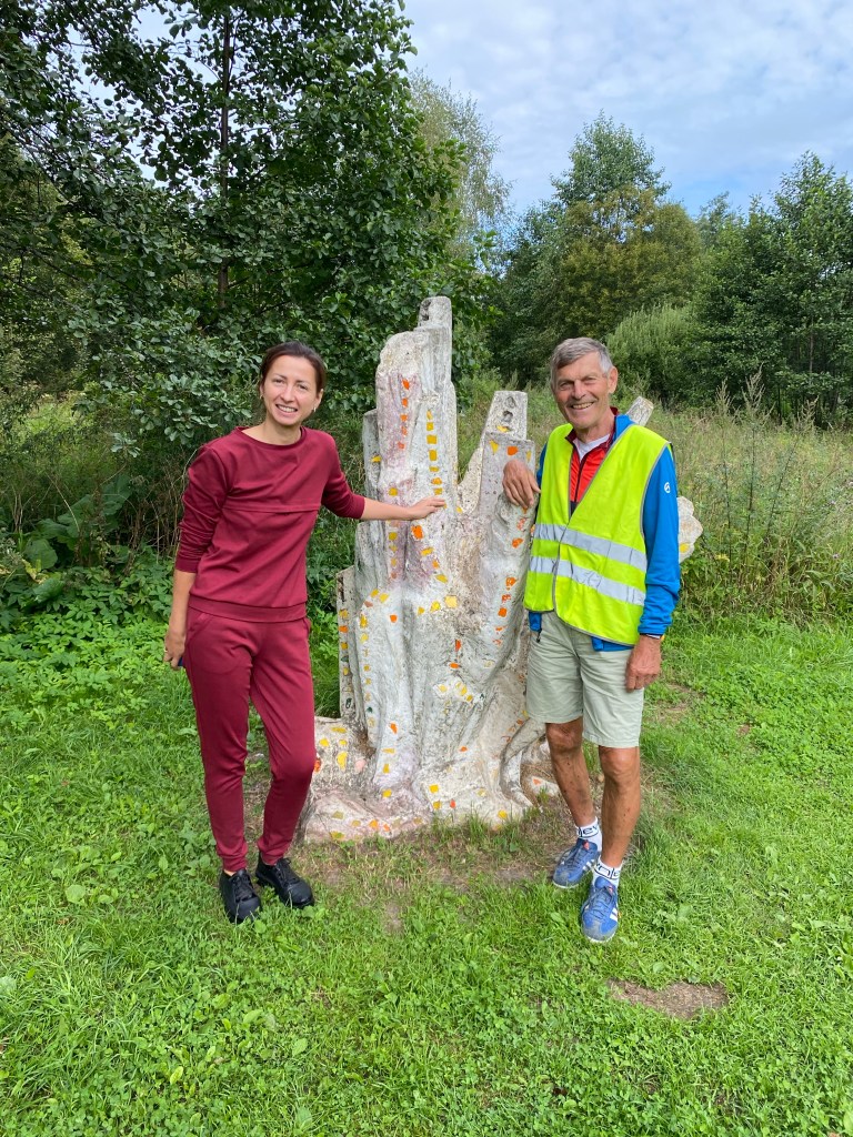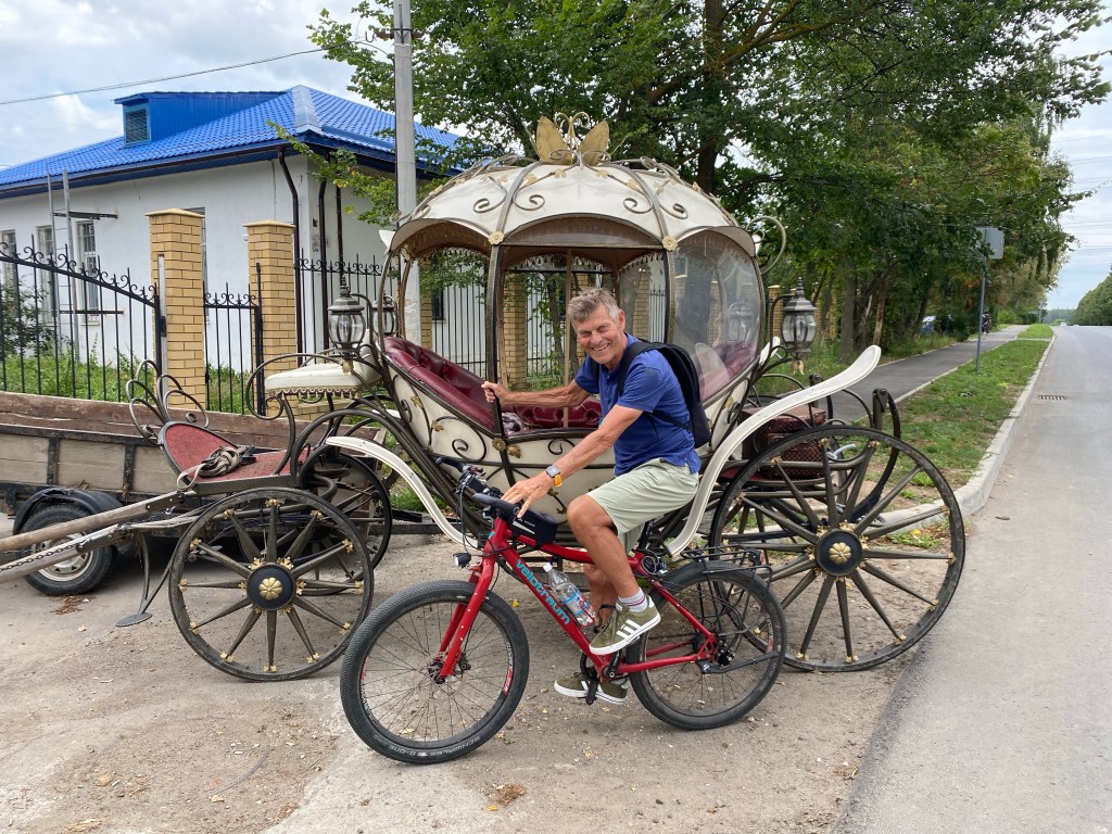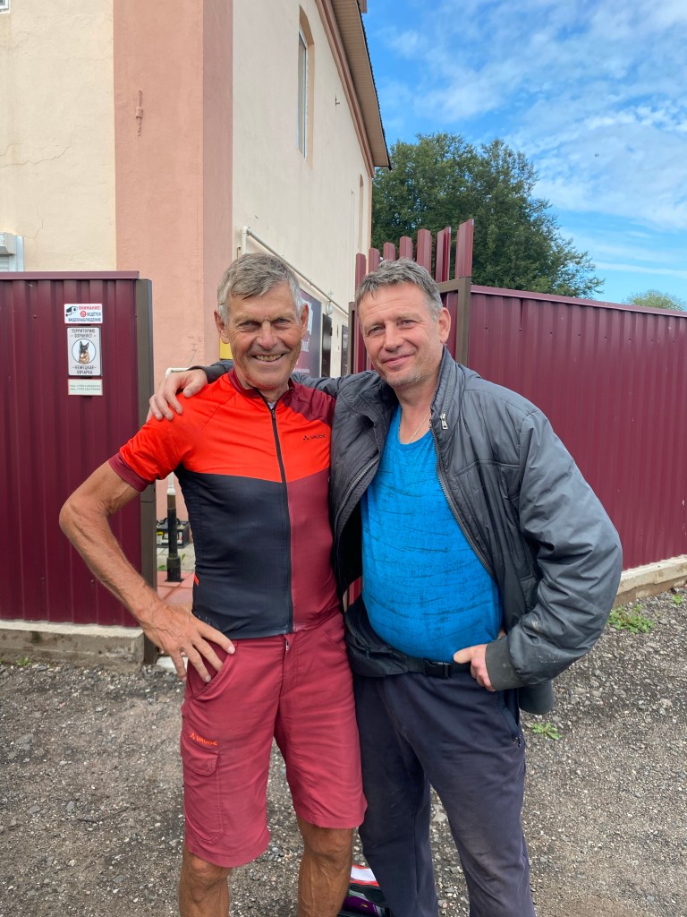 Es gibt schon vor dem Frühstück wieder viel zu organisieren. Wer trifft wen wo, ist die Frage. Ich fahre bei bedecktem Himmel los und habe die Regenkleidung schon bereit. Komoot mach mal wieder einen Scherz mit mir und schickt mich ins Gebüsch. Schon wieder werde ich dreckig. Dafür bleibt es aber von oben her trocken. Schon bald finde ich mich auf der Schnellstraße wieder. Praktisch anfangs ohne Seitenstreifen reihe ich mich in den Verkehr ein. Schon bald ist der Adrenalin-Spiegel höher als der Puls. Einige Male drücken mich die Trucks in den Kiesstreifen neben der Fahrbahn. Nach 50 km treffe ich wie geplant Alexej in Torotynetz. Er reicht mir Tee und ich habe eine kleine Erholungspause. Nach einer knappen halben Stunde reihe ich mich wieder im Verkehr ein. Plötzlich wird aus der Schnellstraße eine richtige Autobahn und ich habe einen zwei Meter breiten, gut geteerten Seitenstreifen und kann mit Rückenwind jetzt Tempo machen.