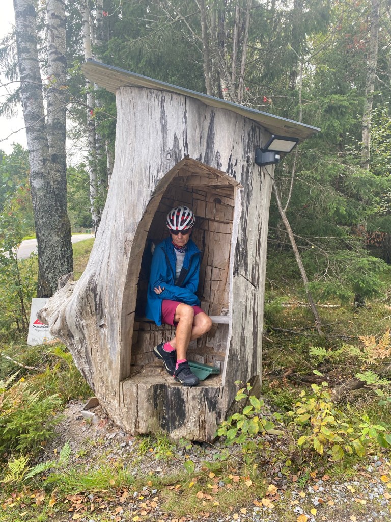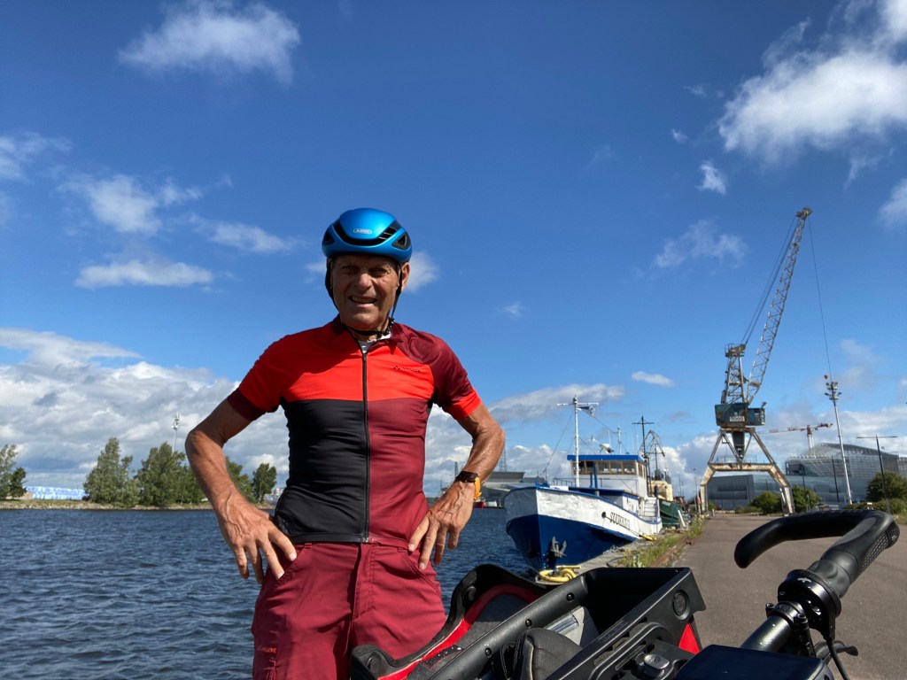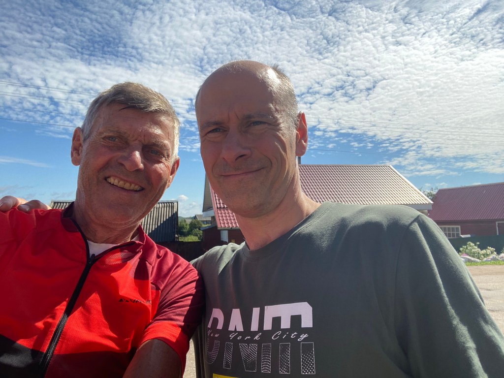 Heute möchte ich mich wieder einmal auf Alfreds Reiseseite melden. Im Gegensatz zu den Männern hatte ich na ja sagen wir mal bescheidene Tage. Ohne Training so eine Reise zu starten ist wagemutig. Mein Stoffwechsel hat ziemlich versagt und ich habe täglich gelitten. Schüttelfrost und Schweißausbrüche haben sich abgewechselt und der tägliche Brechreiz tat sein übriges dazu. Genießen war ein Fremdwort. Habe nur Pater Berno zuliebe weitergemacht. —Das heißt natürlich dass ich kaum essen konnte. Trockene Wecken und Wasser— In der Zeltnacht als es immer feuchter wurde musste ich wieder weinen weil er fast alle 7 Wochen so eine Situation hatte nicht mal ein Zelt: was bin ich für ein kleines ungläubiges Christlein im Gegensatz zu ihm. Was für ein besonderer Mensch. Erzähle als ein Dankeschön an ihn vielen Menschen von ihm wenn sie das Foto am Rücklicht entdecken. Thüringen war das sauberste Land mit den allerfreundlichstenMenschen. In jedem Bundesland und jedem Staat verhalten sich die Menschen anders. Täglich danke ich Gott und unseren vielen Schutzengeln für die bisherige Führung. Vor 2 Tagen der wohl tote Mann auf der Straße und heute morgen vor meinen Augen wurde ein junger Rennradfahrer von einem ausparkenden Autofahrer angefahren sodass es die vordere seitliche Verkleidung weggerissen hat. Starke Blutungen an Armen Händen und Beinen. Die Hand war sicher gebrochen. Habe nur sein Fahrrad auf den Gehweg gestellt und meine Hand war blutig. Es waren gleich viele Ersthelfer da bis der Krankenwagen kam. Mit diesen Dingen habe ich natürlich Stunden zu kämpfen. Ich habe das Gefühl dass alle Menschen nur noch unterwegs sind. An Euch alle ganz liebe Grüße aus Schweden das wir heute erreicht haben. Gott schütze euch.