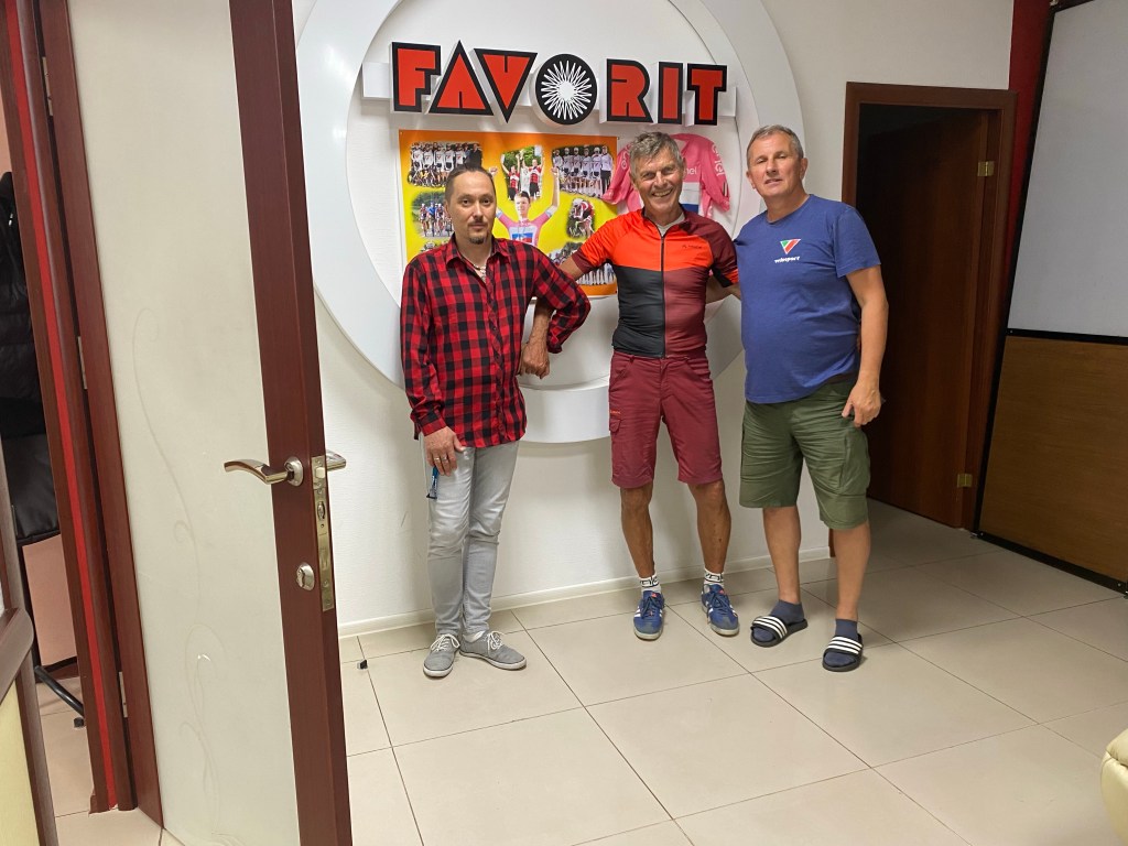 Nach dem Frühstück bei Ina und Nicolai, den Bekannten von Ivan, mache ich mich gleich auf den Weg zum geplanten Treffpunkt bei Igor Babin. Er hat eine Fahrradreparatur-Werkstatt und kennt die Strecke, die mich die letzten vier Tage erwartet. Dort treffe ich auch wieder Ivan, der mir mit dem Taxi mein Gepäck bringt. Igor ist das Sinnbild ein Radmechanikers. Als Teekannen-Untersetzer benützt er eine Bremsscheibe. Er zeigt mir stolz sein Specialized Fahrrad. Nach gut anderthalb Stunden und einigen Tassen Tee hat er mir auch seine Strecke erklärt, wie er sie fahren würde. Es soll auf jeden Fall nicht mehr auf stark befahrenen Schnellstraßen weitergehen. Wir werden sehen.