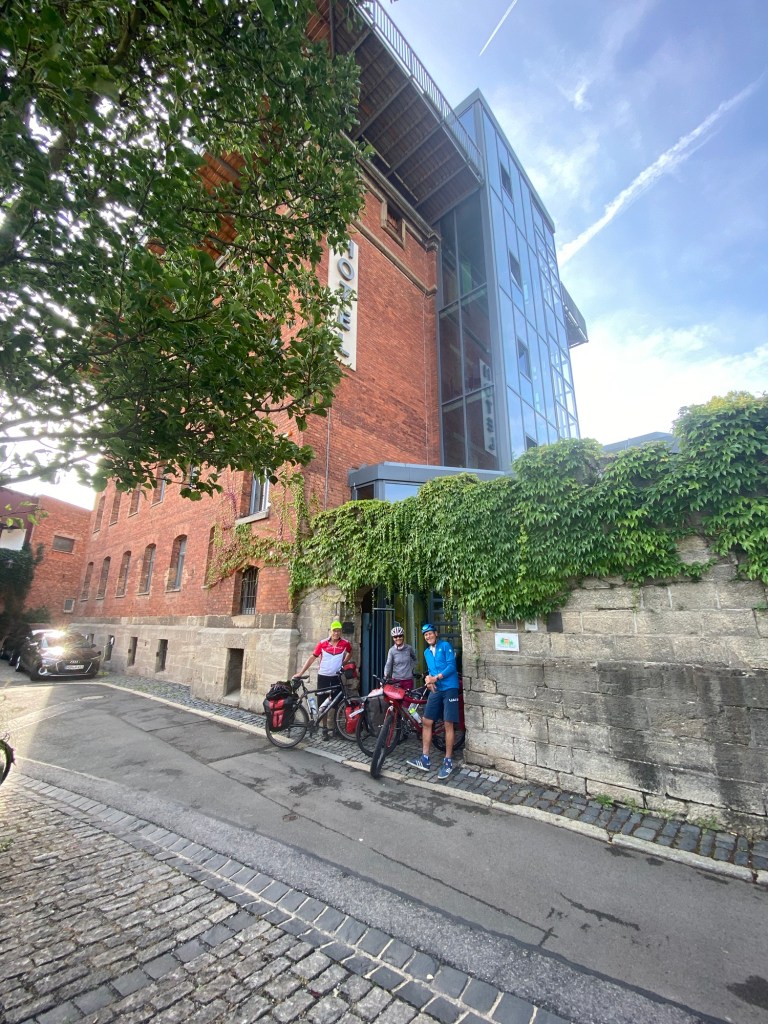 Es ist Sonntagmorgen und es regnet . So lassen wir uns mit der Abfahrt Zeit bis der Regen etwas nachlässt. Die Temperaturen sind trotz des Regens angenehm. So fahren wir kurz und spüren, wie der Regen bereits auf der Haut verdunstet. In Neustadt an der Saale planen wir eine kurze Mittagspause ein. Einem kräftigen Regenguss können wir unter dem Dach eines Buswartehäuschens entgehen. Am späten Nachmittag erwartet uns noch ein erster heftiger Anstieg auf stark befahrener Straße. Erstmals ziemlich ausgepumpt erreichen wir einen Höhenzug, der früher bis zur Wende West – von Ostdeutschland trennte. Traurige Überreste in Form von halbzerfallenen Wachtürmen zeugen noch von dieser Zeit. Das Tagesziel war Meiningen, eine schöne thüringische Kleinstadt mit historischen Gebäuden. Nach langem Zaudern konnten wir Brigitte überzeugen, in einem ehemaligen Gefängnis zu übernachten. Jedoch nach einem herzlichen Empfang einer jungen Dame am Empfang war das Eis gebrochen. Die saubere, moderne, geschmackvolle Einrichtung ließ schnell vergessen, dass hier einmal Bösewichte einquartiert wurden… Und so ein Frühstück wie wir bekamen, konnten sie sich wahrscheinlich nicht mal erträumen…