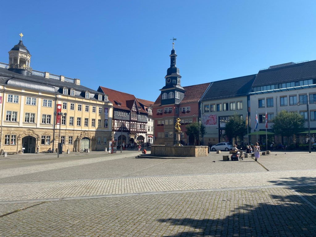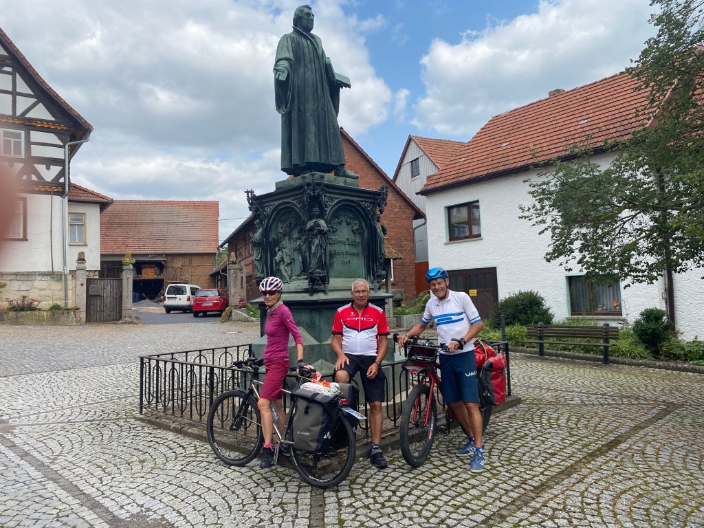 Erstmals bekommen wir mit, dass der Sommer bald zu Ende geht- es ist neblig und kalt, als wir ohne Frühstück losfahren. Das bekommen wir nach knapp 2 km in einem Café in Herrlishausen. Dieser Ort ist bekannt geworden durch Film und Fernsehen als geteiltes Dorf in der DDR-Zeit, wo der eine Nachbar in der DDR wohnte, der andere in der BRD. Heute liegt die Ortschaft in Thüringen und wir bekommen ein sehr gutes Frühstück. Nach einer knappen Stunde erreichen wir auf schönem Radweg die Lutherstadt Eisenach. Leider drängt die Zeit und wir können nur kurz das Zentrum besuchen, nicht aber die Wartburg und das Luther-Museum.