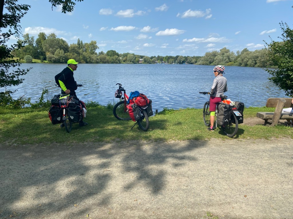 Es wird sehr spät heute, bis wir wegkommen. Dann holen wir Gento auf dem Zeltplatz ab. Nach kurzer Zeit merkt er, dass seine Mütze fehlt. So fährt er nochmals zurück und findet sie tatsächlich. Aber es läuft heute prächtig. Kaum befahrene Landstraßen mit mäßigem Verkehr, zahlreiche schöne Radwege und wieder unterstützender Rückenwind lassen uns rasant Vorwärtskommen. Bald überqueren wir in Lauenburg die Elbe und die Gewässer links und rechts des Weges nehmen zu. Es geht über Mölln und Ratzeburg nach Lübeck. Die schwülwarme Temperatur kann uns wenig anhaben. Wir fahren viel durch Wald und schattenspendendem Bewuchs entlang der Straße.