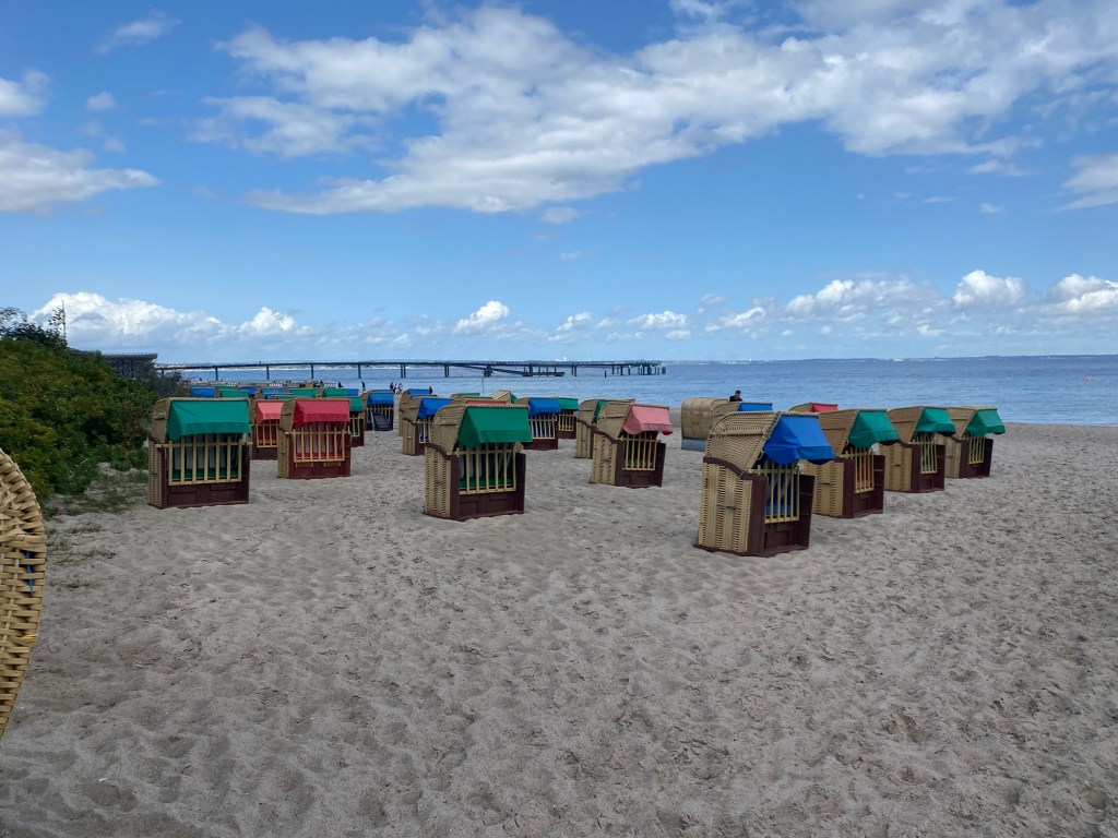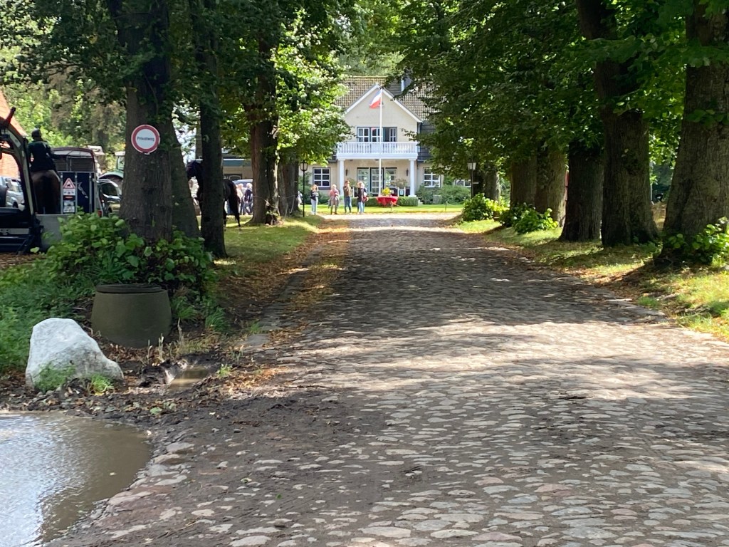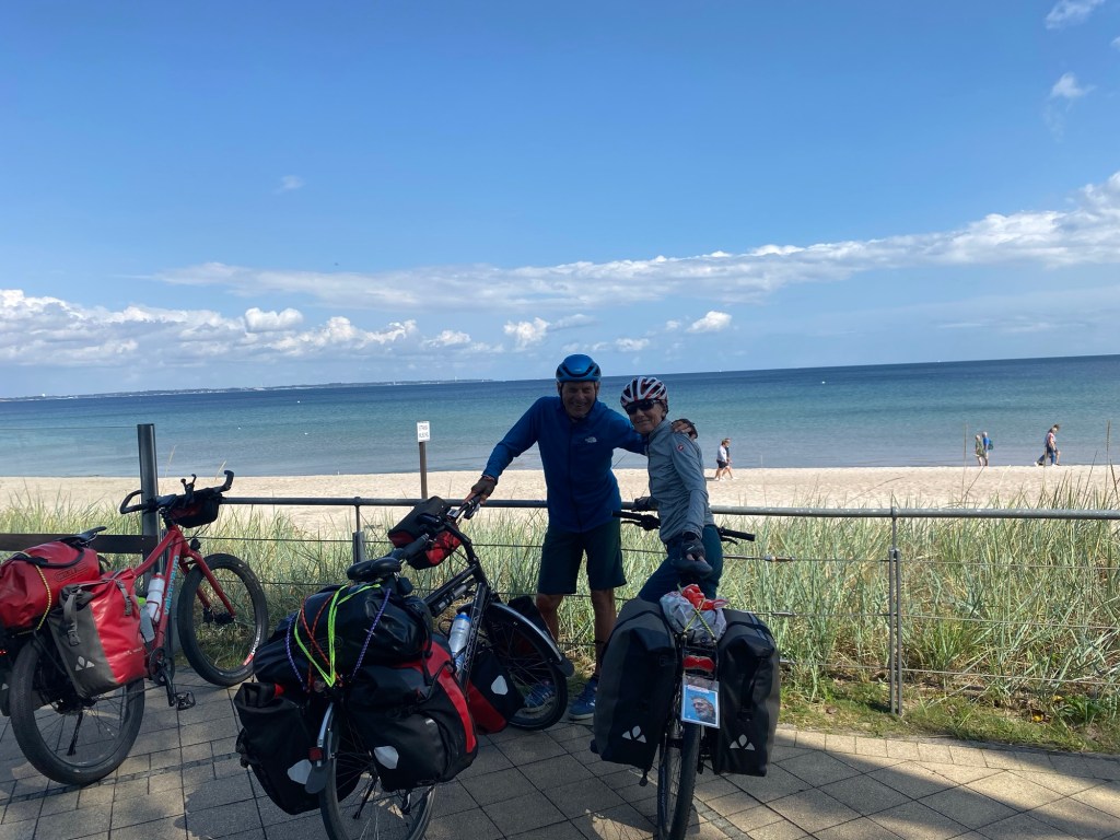 Nachts regnete es und auch während des Frühstücks. So ließen wir uns Zeit mit der Abfahrt. Es war kühl und es gab eine steife Brise. Auf dem Weg zum Timmendorfer Strand stießen wir auf einem klassischen Gehöft auf eine Jagdparade. Eine Gruppe uniformierte Reiter(innen) hoch zu Ross und ein ganzes Rudel energiegeladener Jagdhunde machten sich bereit, während eine andere Gruppe das Jagdhorn blies. Leider verloren wir bei der Gelegenheit Gento aus den Augen und hatten Mühe, ihn am Timmendorfer Strand im Menschengewühl wiederzufinden Wir genossen noch für 10 km die Fahrt am Strand entlang und nahmen uns auch die Zeit, die Beine nach ins 10 Grad warme Meerwasser zu strecken..