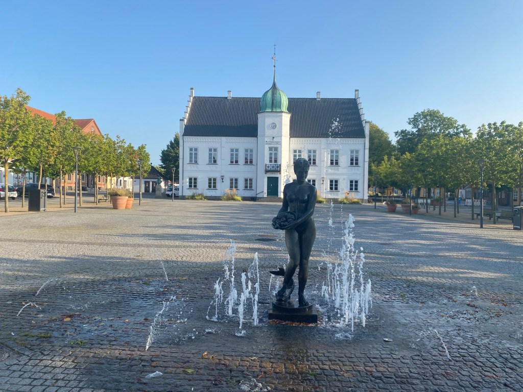 Am Fährterminal nach Dänemark Maribo mit Rathaus und Frau im WasserUnd der Bürgermeister sitzt vor der Türe