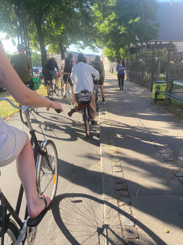 Die erste Zeltnacht seit langem ist gewöhnungsbedüftig. Das Wetter ist einladend, der Zeltplatz auch, aber der Aufbau und der Abbau laufen nicht mehr so zügig wie gewohnt. Das Zelt ist morgens nass vom Tau und nachdem wir erstmals die Gelegenheit hatten Kleider zu waschen kommen wir relativ spät weg. Eigentlich wollten wir gegen Mittag in Kopenhagen sein, jetzt ist es aber fast 16 Uhr, als wir am Tivoli Halt machen mit einer kleinen Stadtrundfahrt mit dem Fahrrad. Erstmals habe ich das Gefühl in einer europäischen Hauptstadt, dass es mehr Radfahrer als Autofahrer gibt. So gibt es vor den Ampeln keinen Auto- sondern Fahrrad-Stau.
