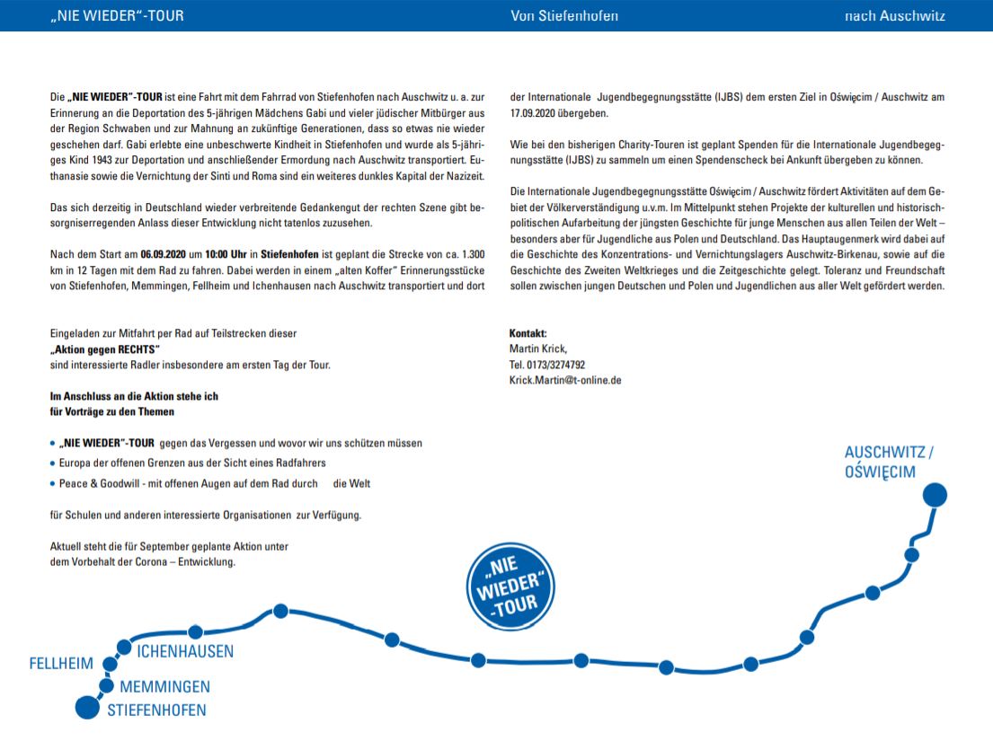 Martin Krick aus Babenhausen plant eine Radtour von Stiefenhofen nach Auschwitz in Gedenken an Gabriele Schwarz und weitere Opfer der Nazi-Diktatur. Er nennt die Aktion „Nie wieder Tour“ Der Start ist am 6. September 2020 um 10 Uhr in Stiefenhofen. Innerhalb 12 Tagen will Martin mit seinen Begleitern die Strecke von 1300 km zurücklegen.
