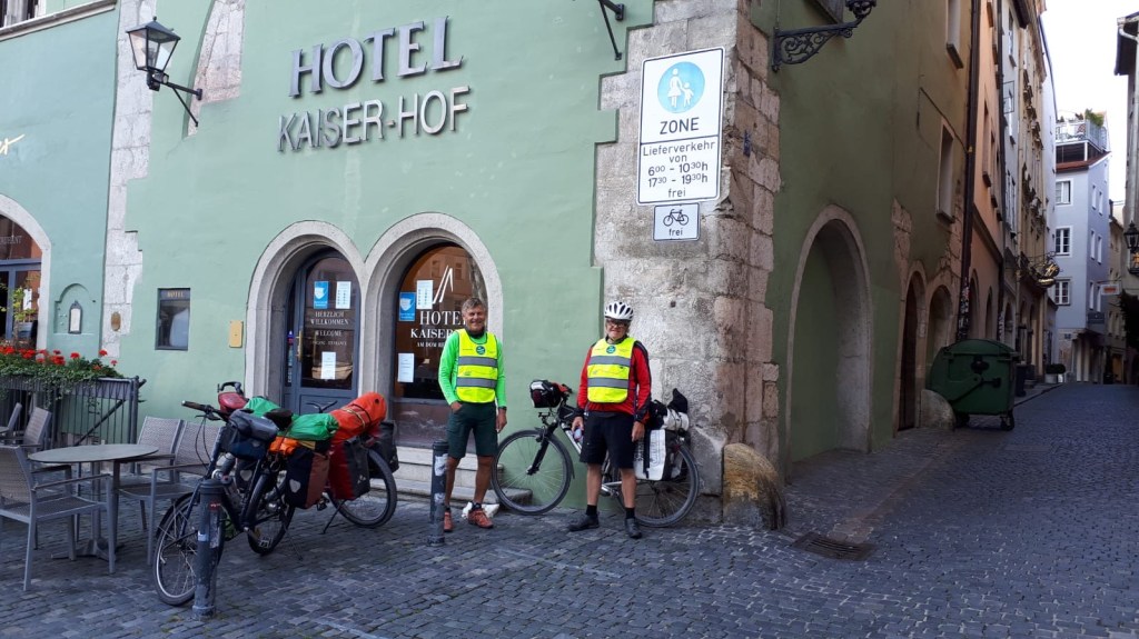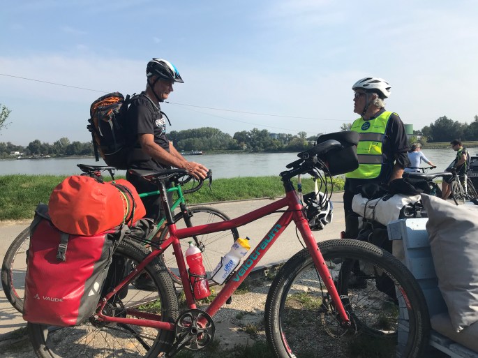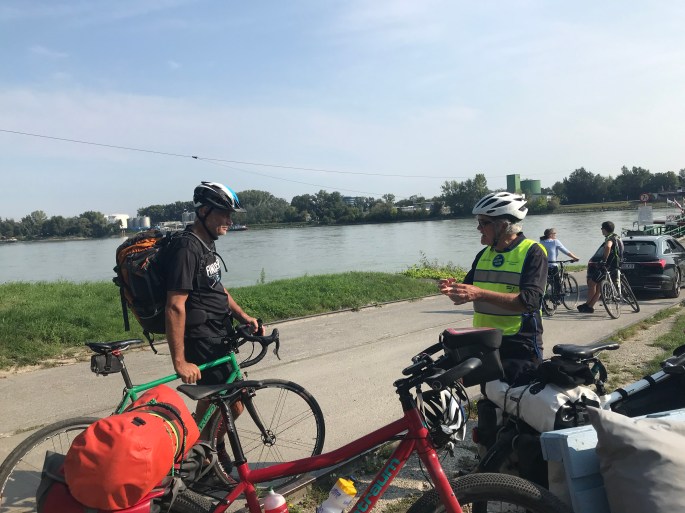 Kurz vor Wien treffen wir Walter Hauer und Elisabeth Mattes. Mit ihnen war ich letztes Jahr auf der Karpaten-Tour. Sie laden uns ein, auf ihrer Badehütte auf der Donauinsel nahe Korneuburg zu übernachten. Anderntags fährt Walter mit uns die gesamte Etappe bis zur slowakischen Grenze. Es ist „sein Revier“ und nachdem er sich sehr gut auskennt, sind wir schon um die Mittagszeit an der slowakischen Grenze in Andern.
