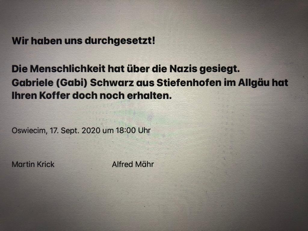 Er wird neben seinem persönlichen Gepäck einen Koffer aufsatteln, um persönliche Erinnerungsstücke von Stiefenhofen nach Auschwitz zu bringen. Diese will Martin in Auschwitz der Internationalen Jugendbegegnungsstätte übergeben.