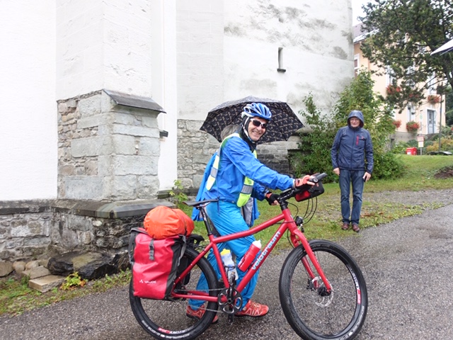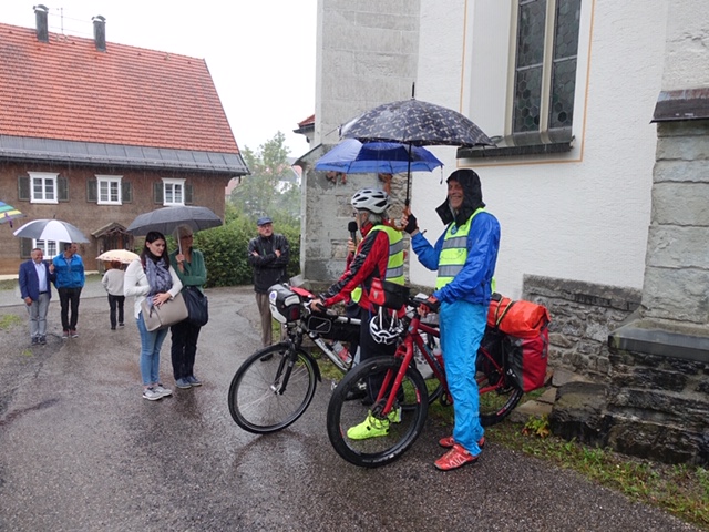 Tags zuvor habe ich mein Rad bei Jörg in Schönau deponiert. Bei der Abfahrt am Sonngtagmorgen mit Brigitte und Jorge im Auto in Vogt ist es zwar noch trocken, doch die dunklen Wolken und der Wetterbericht verheißen nichts Gutes. Ich steige bei Jörg in Schönau um auf das Rad und werde gleich zum ersten Mal nass. Aber erstmal unter der Regenkleidung, denn ich komme an den Steigungen mächtig ins Schwitzen. Nach einer ersten kurzen Begrüßung von Martin und seinen Töchtern und den anderen Begleitern, beginnt auch schon die offizielle Zeremonie durch verschiedene Ansprachen, u.a. durch Leo Hiemer, der den Fall von Gabi Schwarz unter anderem in einem Buch und einem Film dokumentiert hat. Martin Krick erläutert den Anwesenden, warum er diese Aktion „Nie wieder “ Tour geplant hat und sie gerade jetzt durchführen will.