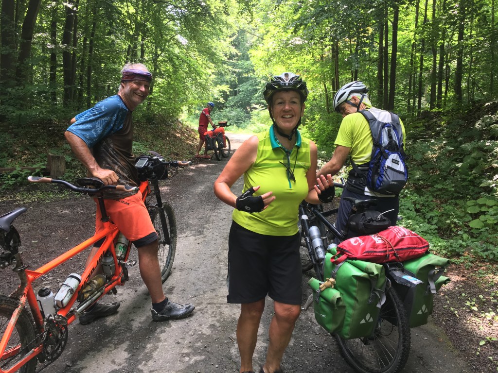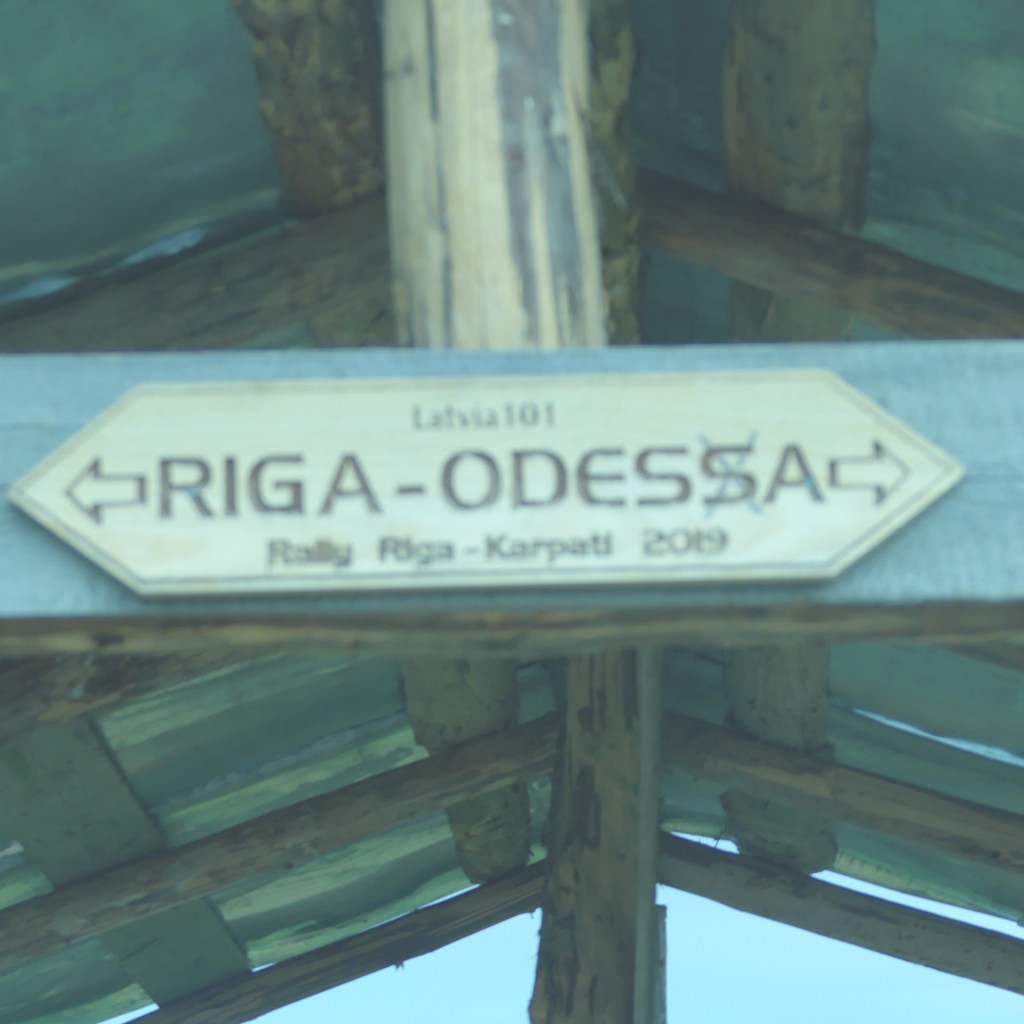 Nach dem Frühstück in einer ehemaligen tschechoslowakischen Polizeistation geht es bei relativ kühlen Temperaturen gleich bergan, sodass uns schnell warm wird. Der Asphalt weicht auch bald einem ziemlich grobschottrigen Weg. Die Steigungsprozente sind aber moderat und schon bald stehen wir auf der ersten Passhöhe an diesem Tag. Oben sehen wir ein Schild, das darauf hinweist, dass hier eine Rally von Riga /Ostsee) nach Odessa /Schwarzes Meer) vorbeiführt. Der Weg runter ins Tal ist steil, holperig und grobsteinig und erfordert volle Aufmerksamkeit. Aber es sind nur 200 hm, danach läuft der Weg entlang eines kleinen Flusses im Tal namens Theresva. Hier sehen wir auf einmal deutsche Orts- und Namensschilder. Anscheinend haben sich hier im 19. Jahrhundert oberöstereichische Holzfachleute angesiedelt. Auch jetzt noch wird in den Schulen in diesem Tal in Deutsch unterrichtet. Alles dreht sich hiet ums Holz. Den ganzen Tag sehen wir LKWs mit Holzladungen. Dieses sind meistens ausgediente Militärlastwagen. Diese werden hier auch zur Heuernte genutzt. Sie sind extrem geländegängig.