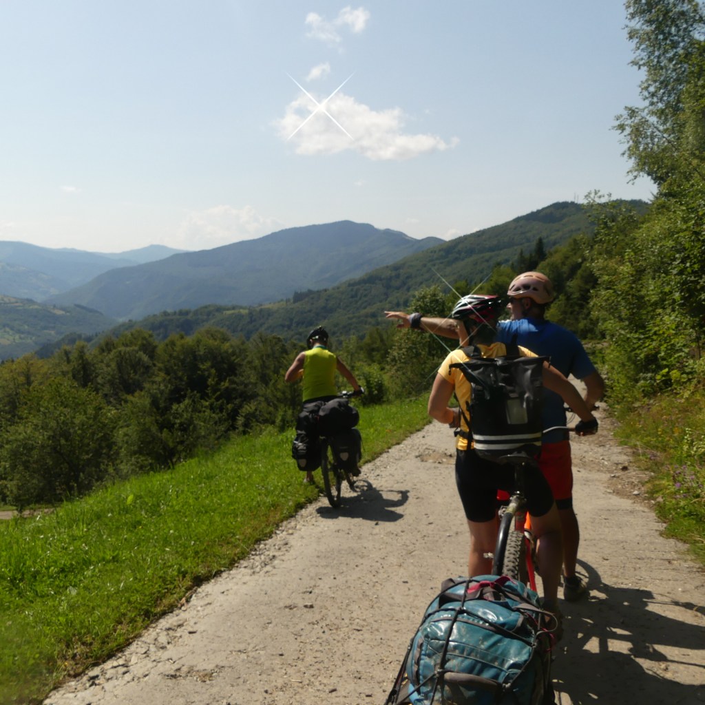 Wir waren heute Nacht scheinbar die einzigen Gäste im Hotel Park. Morgens ist niemand da, bei dem wir die Übernachtung bezahlen könnten. So frühstücken wir in einem Supermarkt und fahren dann nochmals vorbei, um zu bezahlen. Nach längerem Warten klappt es tatsächlich. Erst geht es einige Kilometer der Theis entlang – auf der anderen Seite ist Rumänien. Wir könnten einen Stein hinüber werfen. Selbst sind wir aber für weitere 2 Tage in der Ukraine.. Wir könnten einen Stein hinüber werfen. Selbst sind wir aber für weitere 2 Tage in der Ukraine. Bald zweigen wir auf eine Nebenstraße ab und der Verkehr wird immer weniger. Dafür steigt die Straße immer mehr an und endet wie gehabt im groben Schotter, immer wieder aber kommen auch Asphaltstücke. Bis zur Passhöhe sind es insgesamt 733 hm ununterbrochener Anstieg. So viel hatten wir noch nie. Doch die Strecke ist abwechslungsreich und gibt immer mehr Ausblick auf die umliegenden Berge der Karpaten. Immer wieder sehen wir Bauern, die auf den steilen Bergwiesen Heu machen. Die Abfahrt auf der anderen Seite hinunter nach Raciv hat es in sich. Es wäre ein Leckerbissen für Downhiller und ambitionierte Mountainbiker. Wir jedoch haben mit unseren vollbepackten Rädern alle Hände voll zu tun. Nach einem kurzen Trinkstop in Racif geht ew einem Fluss entlang wieder stetig bergauf. Das Ziel ist eigentlich Yasinia, wo wir schon um 15 Uhr nach 67 km und 1000 hm sind. Wir beschließen, noch den nächsten Pass zu überqueren und im nächsten Dorf zu übernachten, um die Etappe für den nächsten Tag abzukürzen. Dort warten nämlich 113 km und 1300 hm. So sind es schon mal 13 km und 300 hm weniger. Dort finden wir ein ansprechendes Hotel, wo wir wieder die einzigen Gäste zu sein scheinen. Es ist ein Wintersportort mit vielen Skiliften. Doch jetzt im Sommer scheint nicht viel los zu sein. Meine 3 Mitradler gönnen sich sogar ein Schwimmen im Pool. Ich ziehe ein Bier vor. Nastrowje
